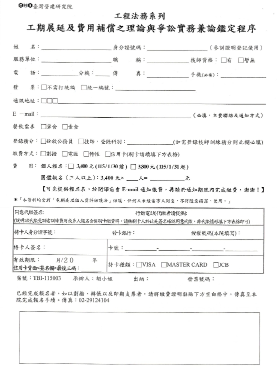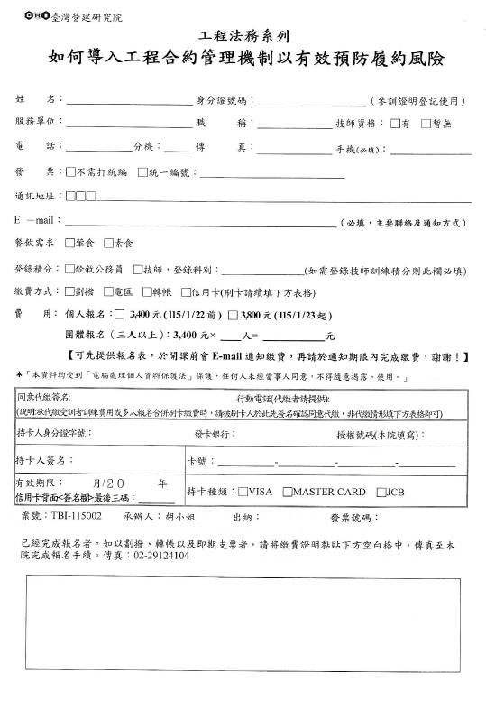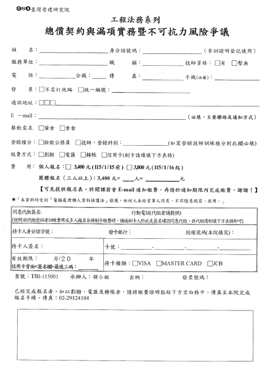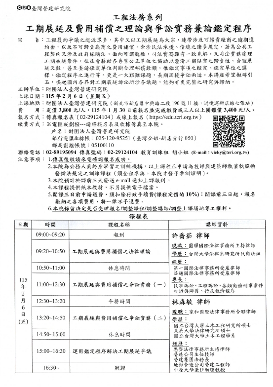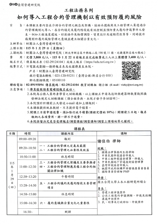本院謹訂於115年1月22日(星期四)、29日(星期四)丶2月6日(星期五)分別開辦 「 總價契約與漏項實務暨不可抗力風險爭議」 「如何導入工程合約管理機制以有效預防履約風險」及 「 工期展延及費用補償之理論與爭訟實務兼論鑑定程序」等法務相關課程,歡迎貴單位派員參訓。