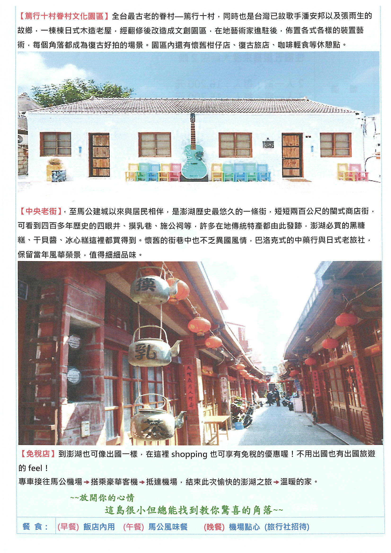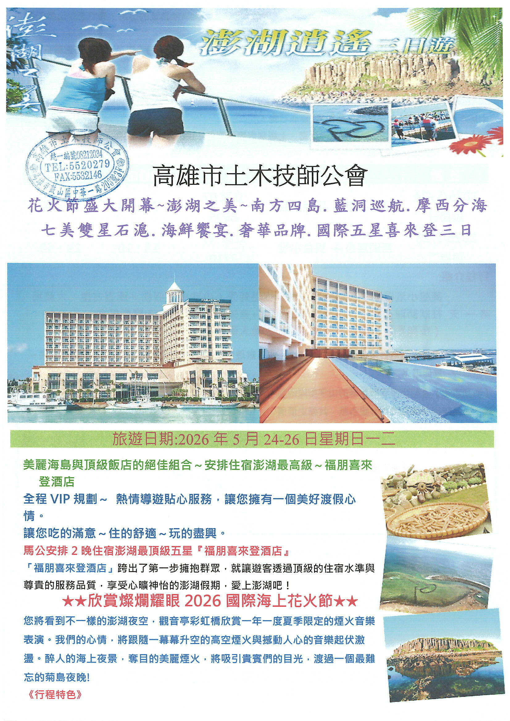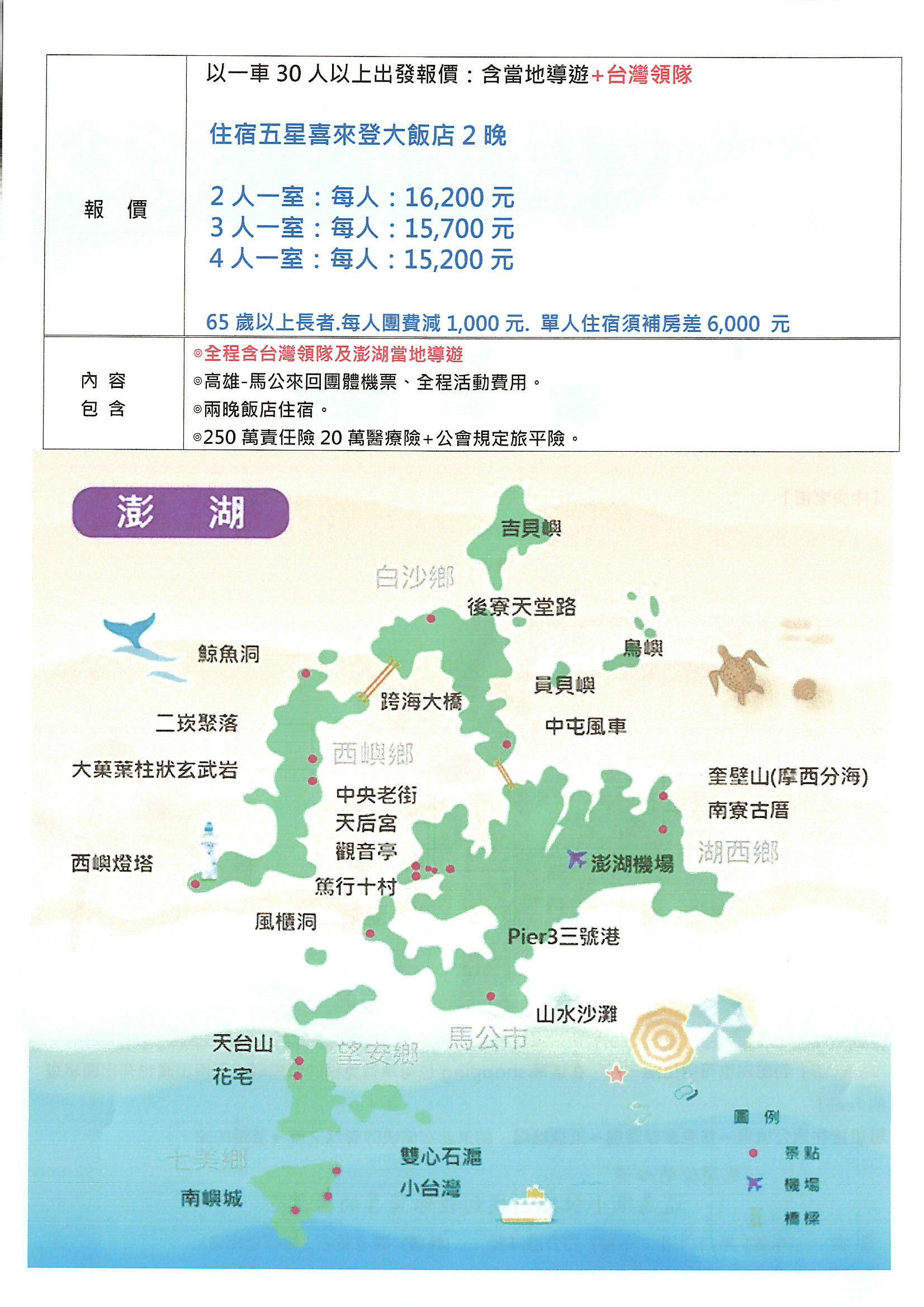 團費含全程司機.台灣領隊+當地導遊費用、高雄-馬公來回團體機票、2晚住宿飯店、2早餐3午餐2晚餐、公會旅平險+責任險250萬意外、20萬醫療)。