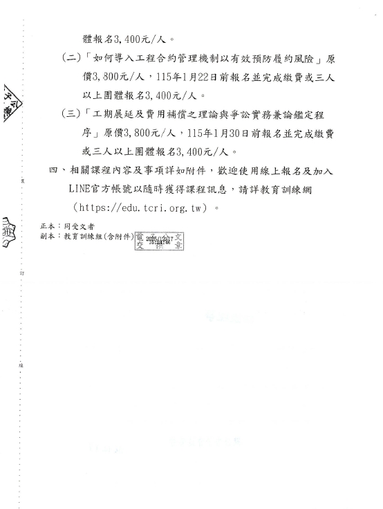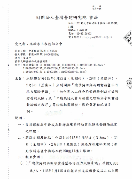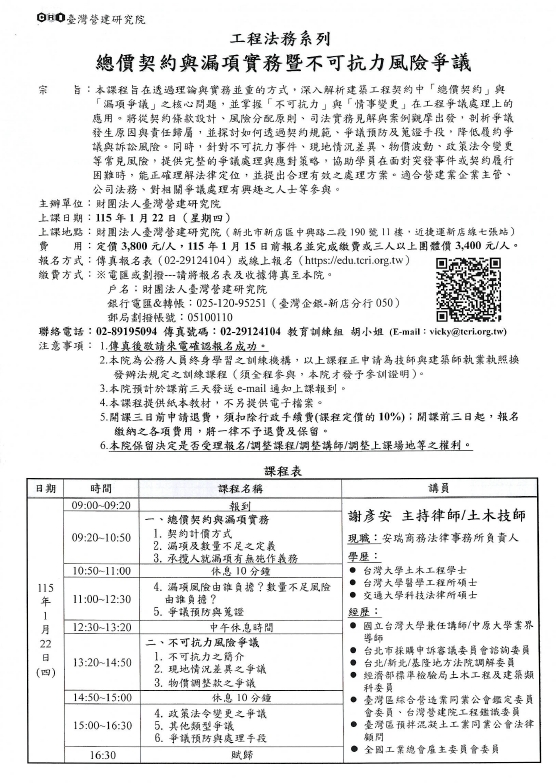 本院謹訂於115年1月22日(星期四)、29日(星期四)丶2月6日(星期五)分別開辦 「 總價契約與漏項實務暨不可抗力風險爭議」 「如何導入工程合約管理機制以有效預防履約風險」及 「 工期展延及費用補償之理論與爭訟實務兼論鑑定程序」等法務相關課程,歡迎貴單位派員參訓。