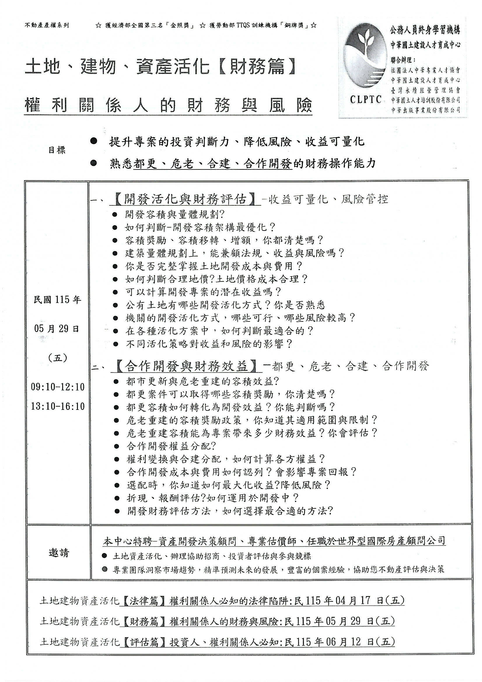 如何避免「錯誤判斷」影響數百萬甚至上億元損失,檢送「不動產計畫《法律篇、財務篇、評估篇》」歡迎薦派同仁參加。