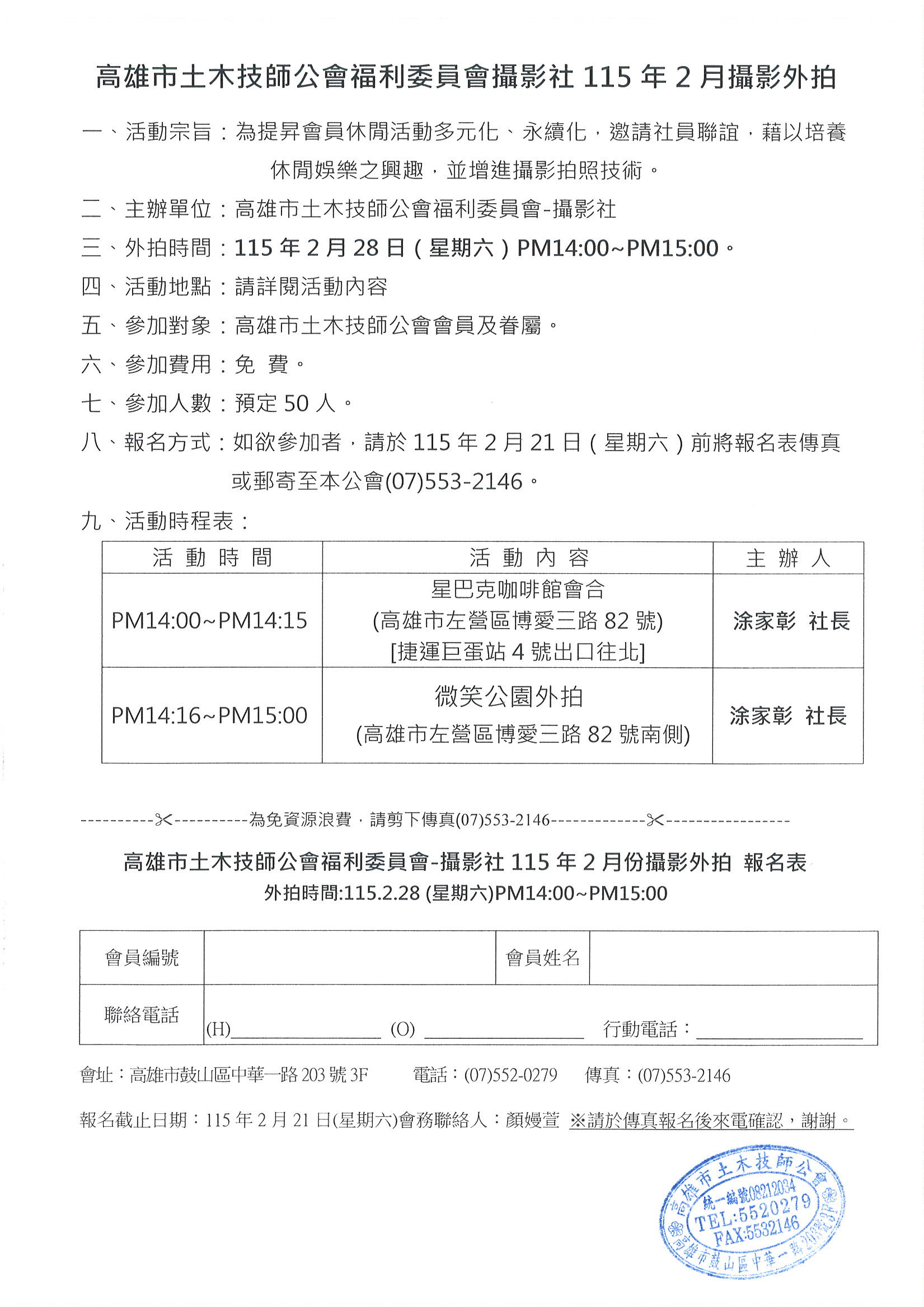 八、報名方式:如欲參加者,請於115年2月21日(星期六)前將報名表傳真(07)553-2146或郵寄至本公會。