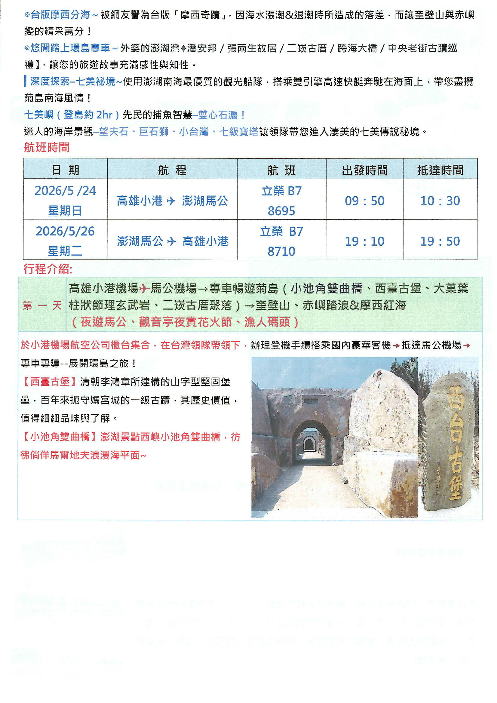 團費含全程司機.台灣領隊+當地導遊費用、高雄-馬公來回團體機票、2晚住宿飯店、2早餐3午餐2晚餐、公會旅平險+責任險250萬意外、20萬醫療)。
