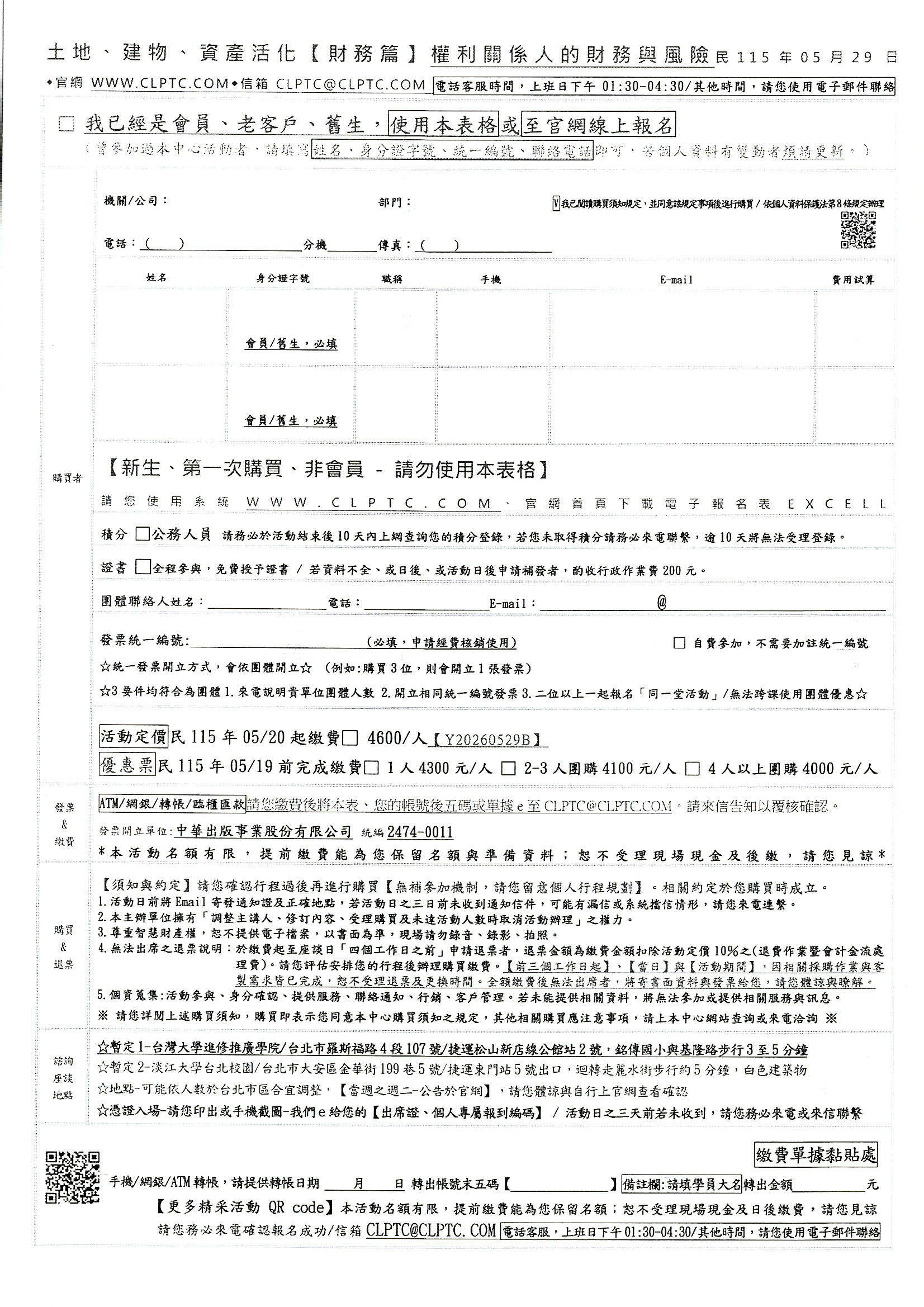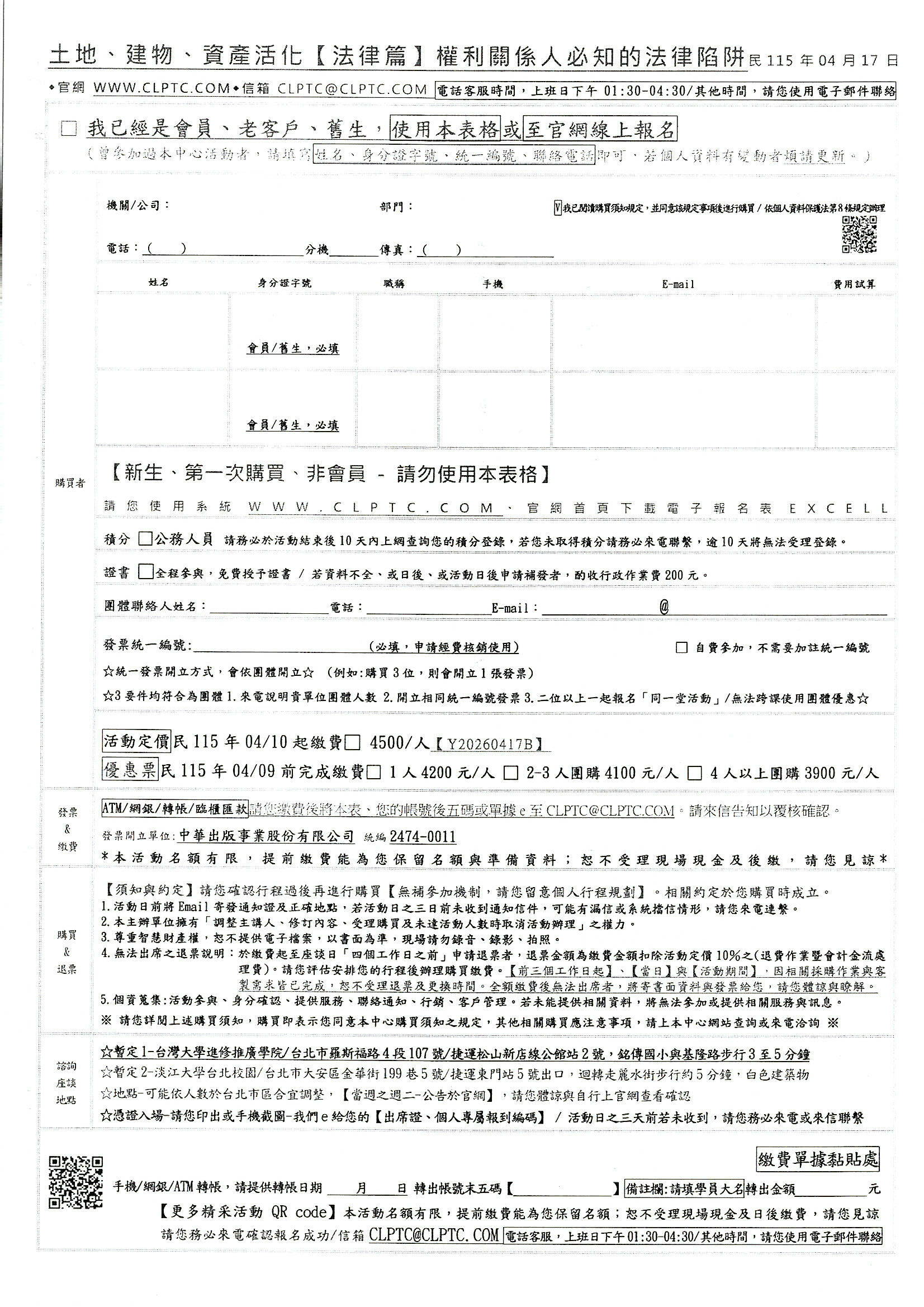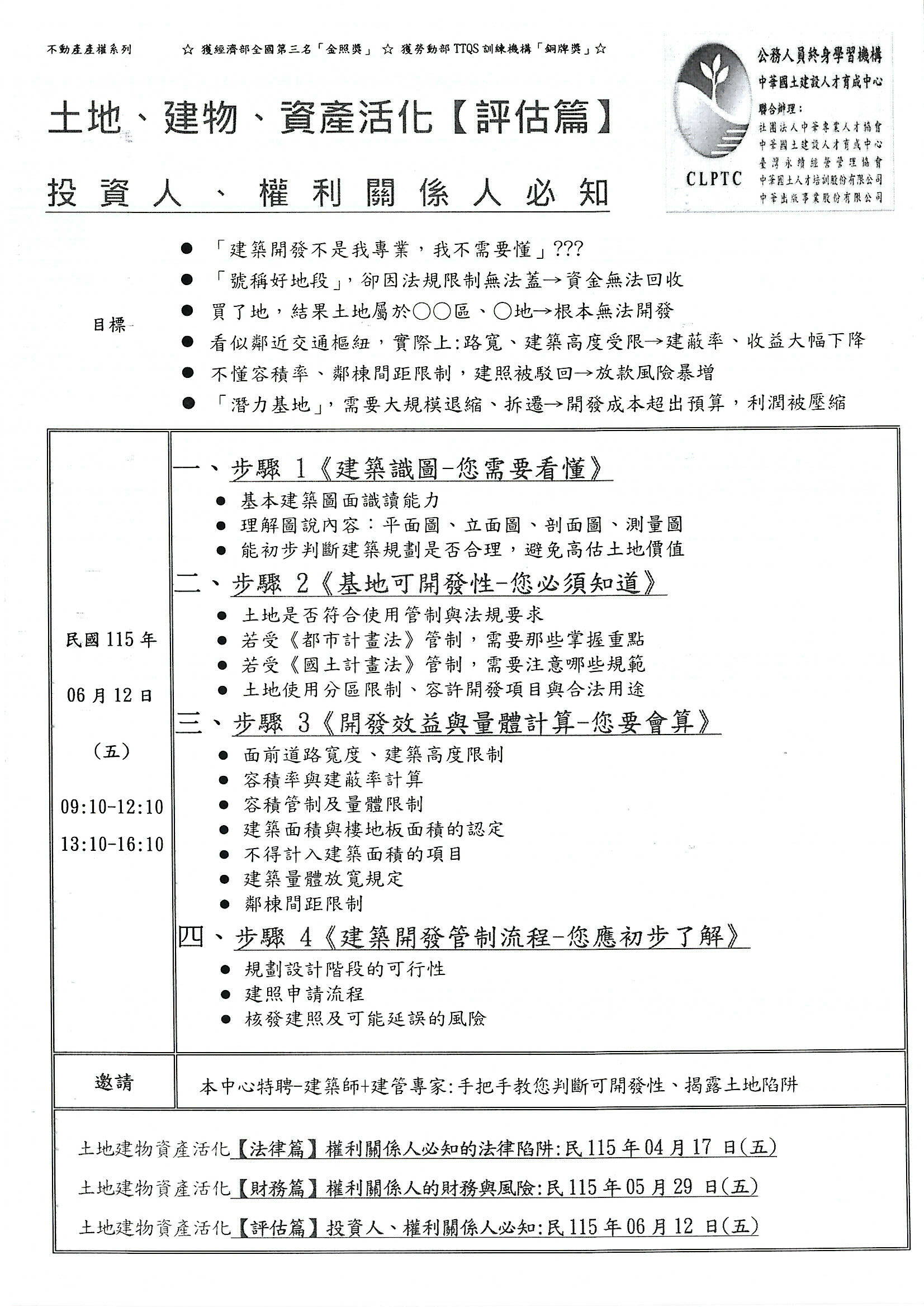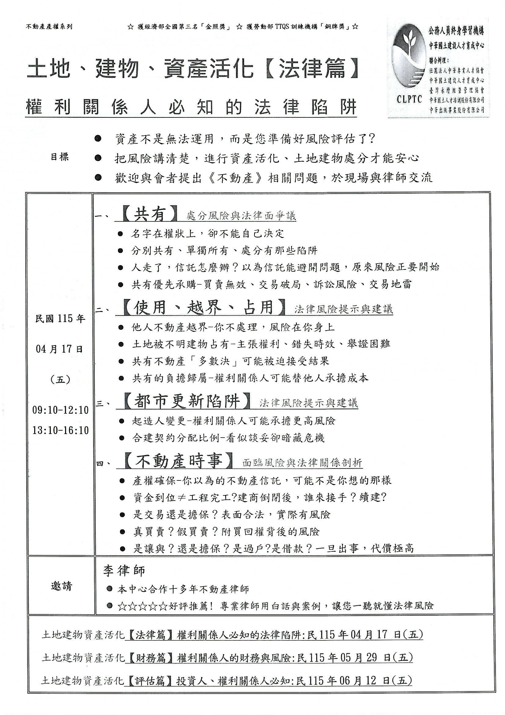 如何避免「錯誤判斷」影響數百萬甚至上億元損失,檢送「不動產計畫《法律篇、財務篇、評估篇》」歡迎薦派同仁參加。