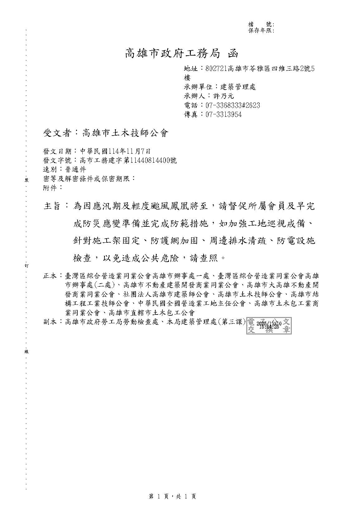 為因應汛期及輕度颱風鳳凰將至,請督促所屬會員及早完 成防災應變準備並完成防範措施,如加強工地巡視戒備、 針對施工架固定、防護網加固、周邊排水清疏、防電設施 檢查,以免造成公共危險,請查照。